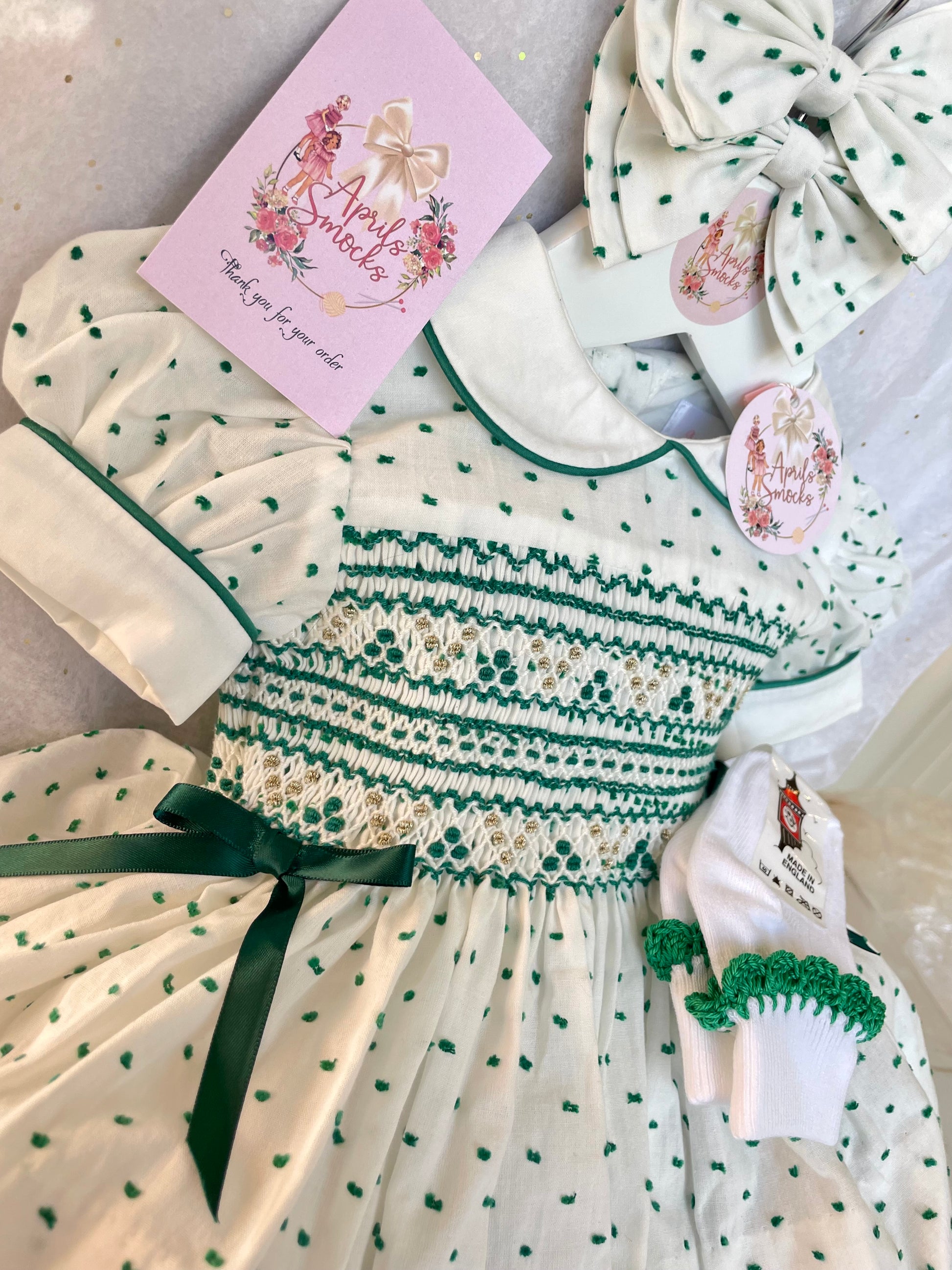 Emerald Green Plumetti Smocked Back & Front Dress With Matching Socks